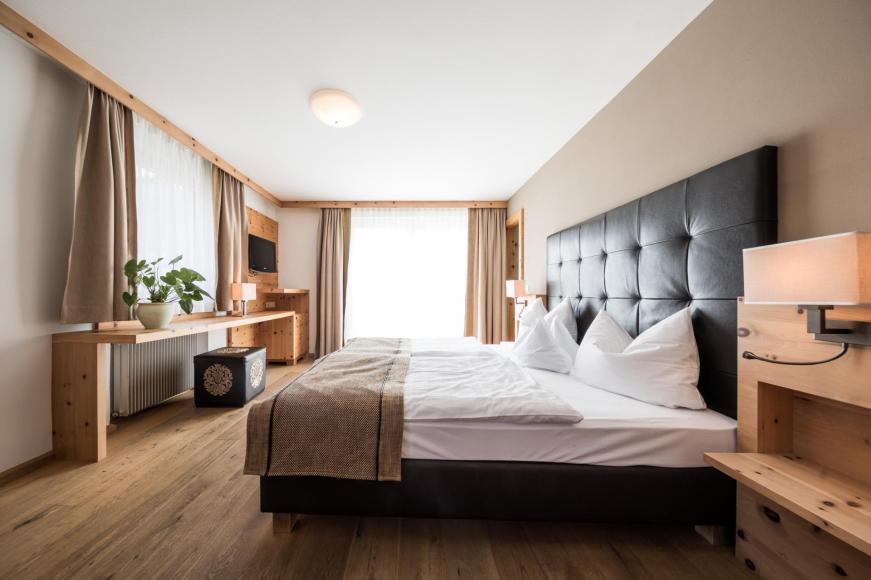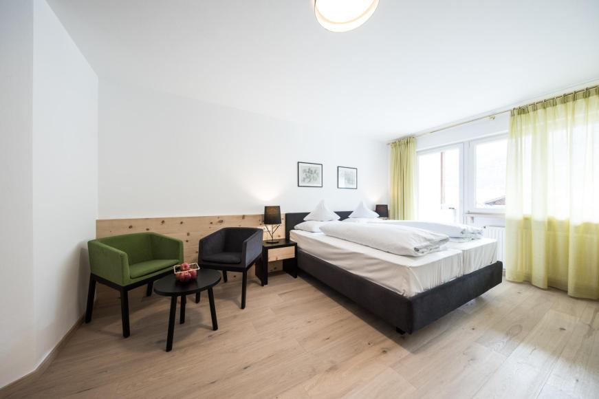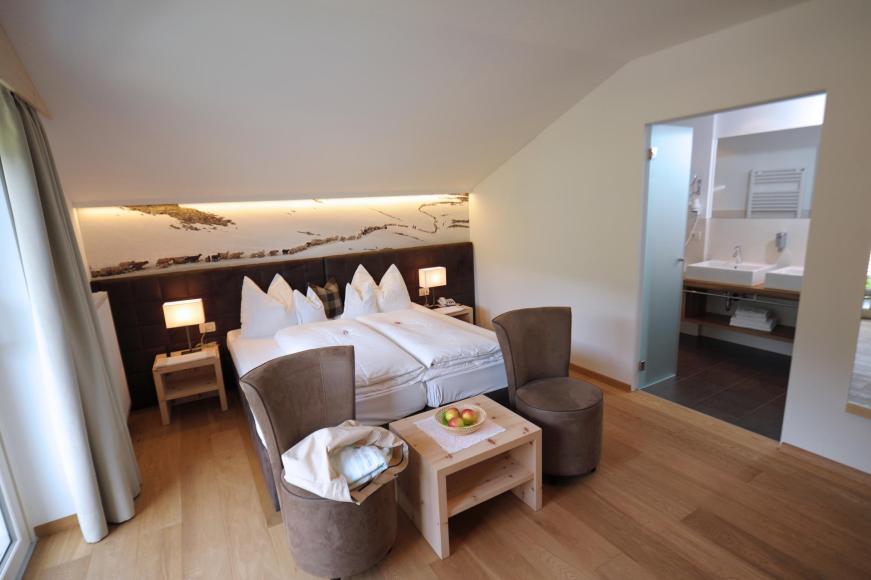 Das DZ Zirm+ mit Südbalkon bzw. Südwestbalkon ist ein modernes, ruhig gelegenes Zimmer mit Holzboden.