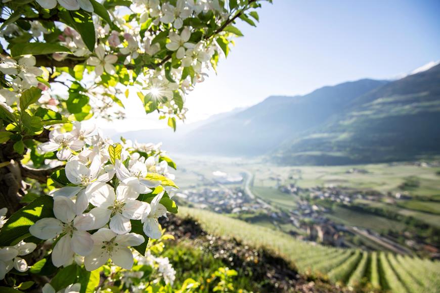 In the Vinschgau Valley, you can experience the beauty of the beautifully blooming vineyards and apple orchards along irrigation canal paths and panoramic trails, or explore the Vinschgau Cycle Path by bike amidst the apple blossoms. Active guests can enjoy guided hotel hikes, guided bike tours, morning yoga, and much more. The small town of Ciardes also has a lot to offer culturally: visits to the fruit cooperative, apple tours and tastings on the farms, asparagus tours, and wine tastings with visits to the vineyards.