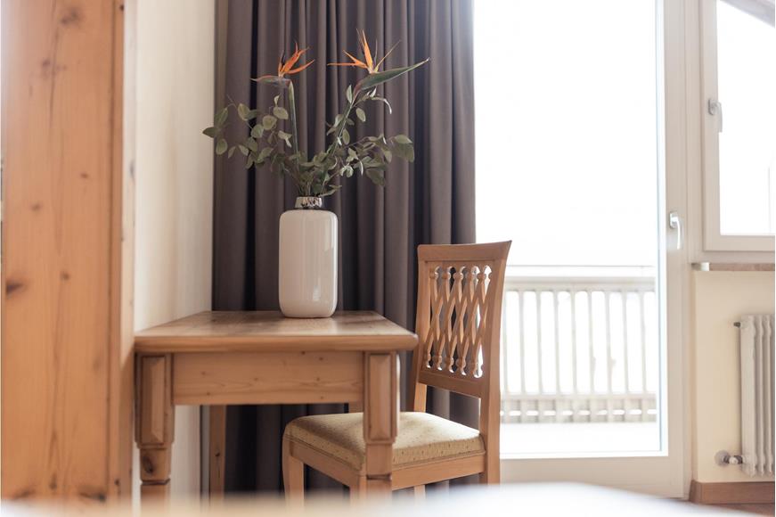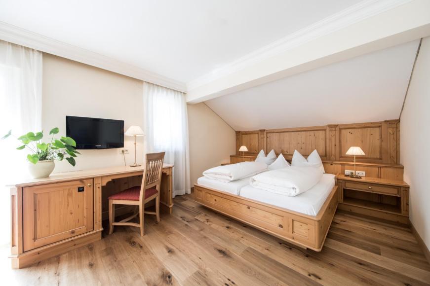 La camera doppia sud (balcone lato sud) è una stanza comoda e tranquilla con pavimento in legno e angolo soggiorno.