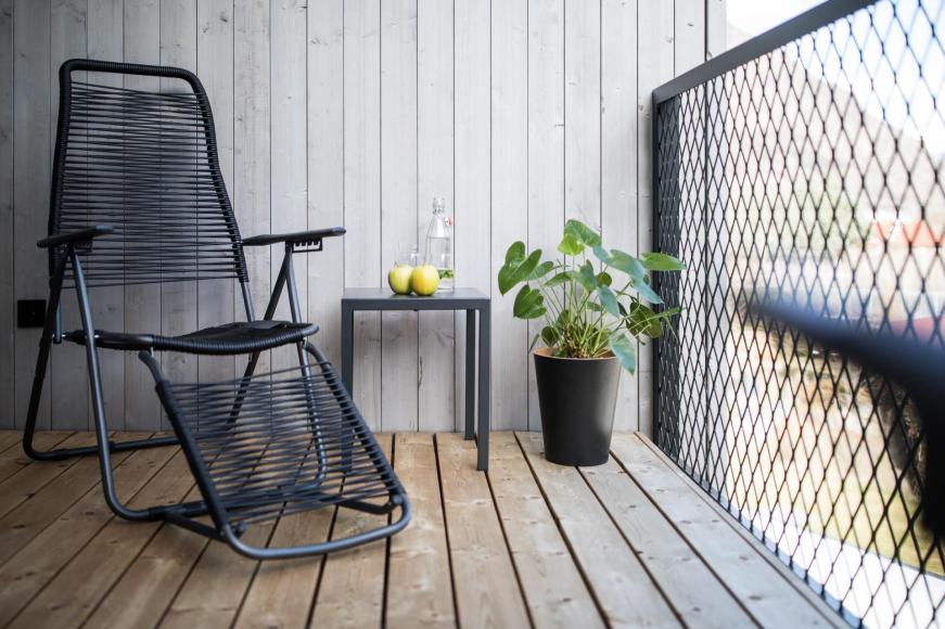 La juniorsuite sud design (balcone loggia lato sud) con pavimento in legno è arredata con una stanza grande luminosa con una vasca panoramica, bagno con doccia, fon, WC e bidet separate, minibar, cassetta di sicurezza, telefono, TV satellitare, accappatoio, borsa Wellness, zaino e wifi.